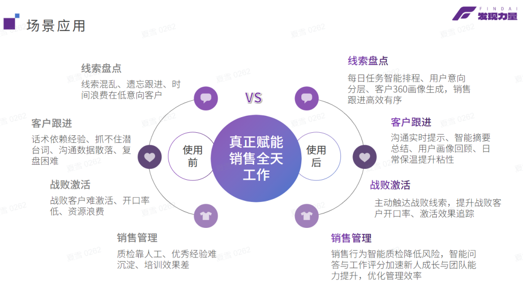 FindAI「闪电」销售助手的定位也是覆盖销售全触点,赋能一线及管理全栈:AI 的目标不是 “取代金牌销售”,而是 “让更多销售变成金牌销售”—— 放大他们的优势,弥补他们的短板,让他们不用再跟 “经验、琐事、短板” 较劲,能把所有精力放在 “跟客户建立连接、促成成交” 上。