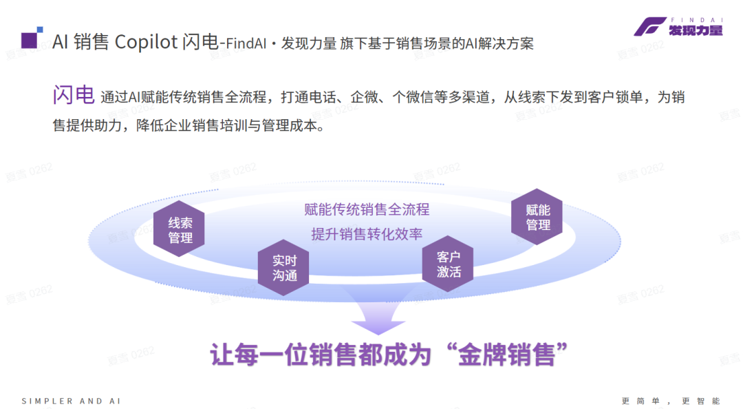 FindAI「闪电」的设计逻辑,从一开始就不是 “替代销售”,而是 “放大销售的优势”:要 “打通电话、企微、个微等多渠道,从线索下发到客户锁单,为销售提供助力”—— 注意,是 “助力”,不是 “代替”。